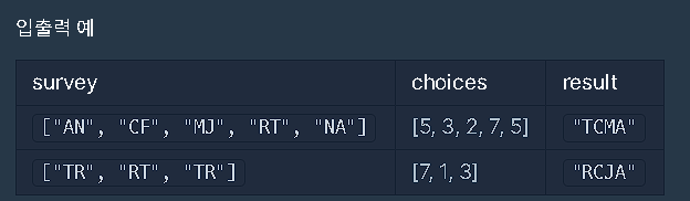 survey[2] = "MJ", choice = 2M(비동의) 점수 +=4 - 2 = 2